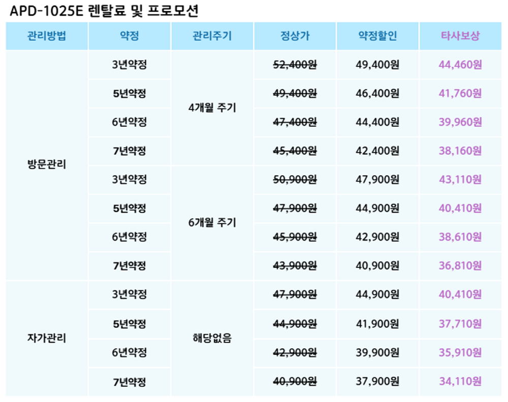 010-7170-2980 빠르고 간편한 렌탈 상담신청 개인정보 수집/이용 내용보기 동의 미동의 ※ 개인정보수집이용 동의 1. 개인정보의 수집 및 이용목적 : 원활한 렌탈 상담 및 주문을 위한 참조자료로 아래와 같은 항목의 개인정보를 수집하고 있습니다 2. 수집하려는 개인정보 항목 : 필수 수집항목 : 이름, 연락처 3. 개인정보의 보유 및 이용기간 : 수집된 정보는 이용자의 정보 삭제 요구 시까지 보관, 활용하며 수집 및 이용 목적이 달성된 후 해당 정보를 지체 없이 파기합니다. 단순 상담고객 3개월 후 파기 / 계약 고객 12개월 후 파기 4. 개인정보 취급 담당자 : 이름 : 연락처 : 010-7170-2980 5. 개인정보 수집 동의거부 사항 : 이용자의 개인정보는 원활한 상담을 위해 수집하고 있으며, 동의하지 않을 경우 상담 및 주문이 제한됩니다. [닫기]