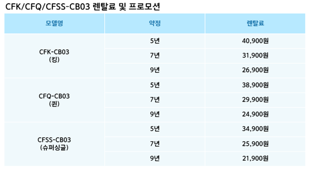CFSS-CB03,CFQ-CB03,CFK-CB03 코웨이 [코웨이] 소프트 쿠션 프레임 (슈퍼싱글,퀸,킹) 제품분류 침대 AS기간 렌탈기간내 최저 렌탈가 월 21,900 (렌탈가) 제휴카드 할인가 월 (렌탈가) 5년 7년 9년 슈퍼싱글 퀸 킹 제품색상 선택 코튼아이보리 + 0원 스톤그레이 + 0원 로즈핑크 + 0원 할인 제휴카드 보기 렌탈신청 장바구니