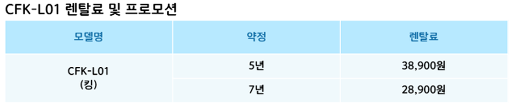CFK-L01 코웨이 [코웨이] 단매트리스 프레임 킹 제품분류 침대 AS기간 렌탈기간내 최저 렌탈가 월 28,900 (렌탈가) 제휴카드 할인가 월 (렌탈가) 5년 7년 킹 할인 제휴카드 보기 렌탈신청 장바구니