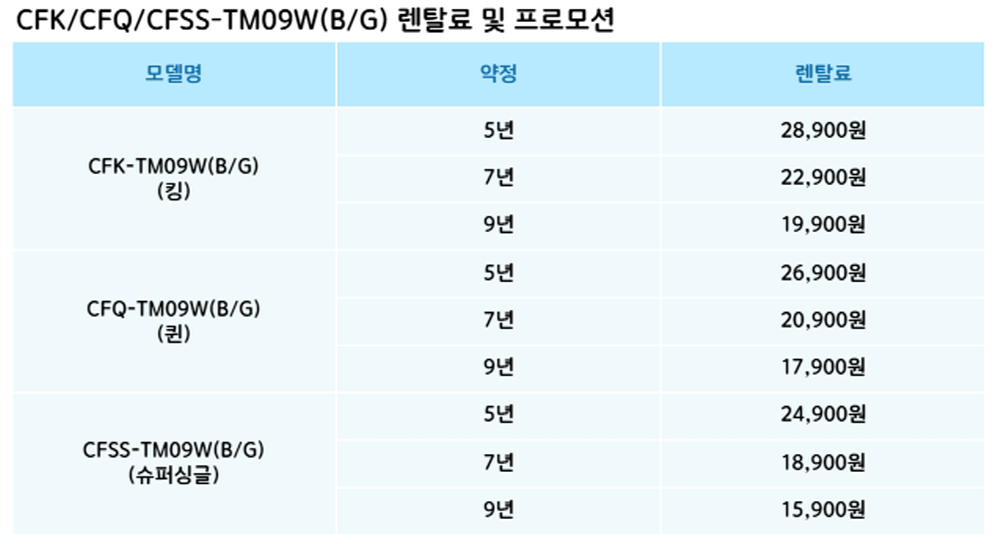 CFSS-TM09W,CFQ-TM09W,CFK-TM09W 코웨이 [코웨이] 투매트리스 프레임 월넛 (슈퍼싱글,퀸,킹) 제품분류 침대 AS기간 렌탈기간내 최저 렌탈가 월 15,900 (렌탈가) 제휴카드 할인가 월 (렌탈가) 5년 7년 9년 슈퍼싱글 퀸 킹 제품색상 선택 그레이 + 0원 다크브라운 + 0원 할인 제휴카드 보기 렌탈신청 장바구니