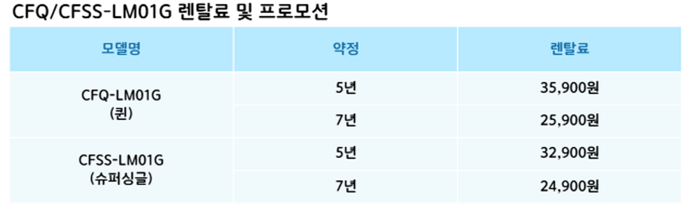 CFSS-LM01G,CFQ-LM01G 코웨이 [코웨이] 단매트리스 패밀리 프레임 (슈퍼싱글,퀸) 제품분류 침대 AS기간 렌탈기간내 최저 렌탈가 월 24,900 (렌탈가) 제휴카드 할인가 월 (렌탈가) 5년 7년 슈퍼싱글 퀸 할인 제휴카드 보기 렌탈신청 장바구니
