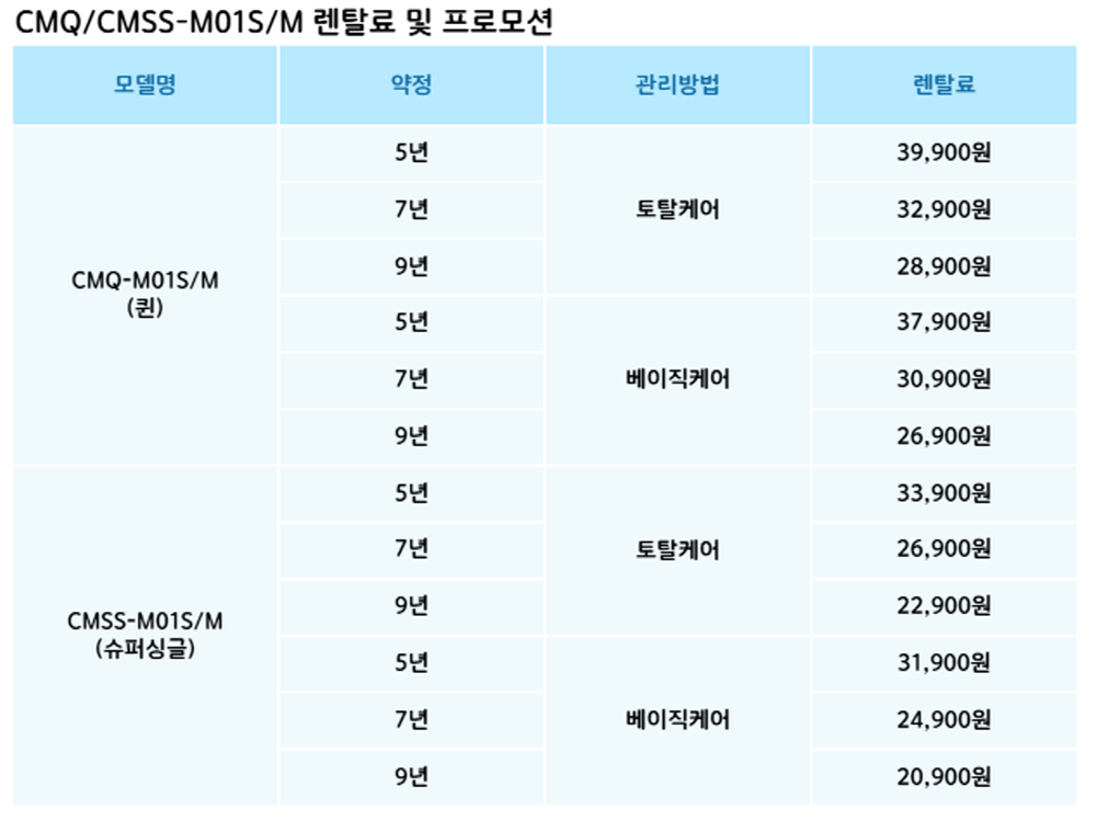 CMSS-M01,CMQ-M01 코웨이 [코웨이] 컴팩트 메모리폼 매트리스 (슈퍼싱글,퀸) 제품분류 매트리스 AS기간 렌탈기간내 최저 렌탈가 월 20,900 (렌탈가) 제휴카드 할인가 월 (렌탈가) 5년 7년 9년 슈퍼싱글 퀸 베이직케어 토탈케어 할인 제휴카드 보기 렌탈신청 장바구니